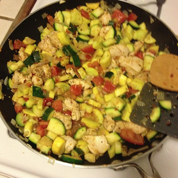 - Chopped the rest of the garlic (I used like 5-6 cloves, but I love garlic, so use as much as you’re comfortable with), the zucchini, squash, and put a heaping amount of the sun dried tomato pesto in a large bowl and mixed them all together with a little (very little) salt then tossed everything in the pan. I stirred fairly frequently, and when I noticed that stuff was starting to stick a little I added more olive oil. Just before it was finished cooking, I added in the tomatoes, then turned down the heat and let everything simmer for a few minutes.