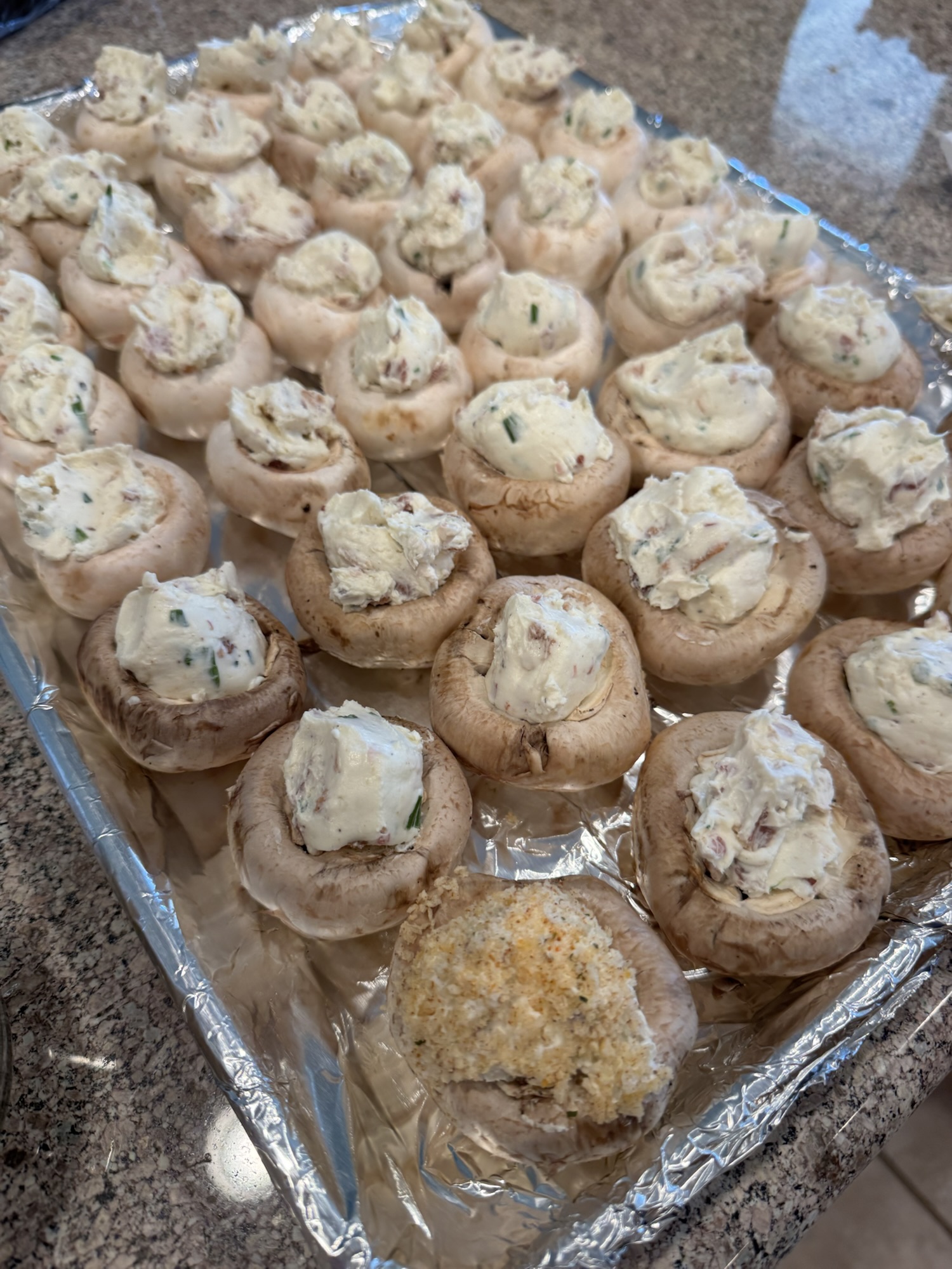 - Stuff the mixture that you just made into the mushrooms (I transferred the goop into a gallon sized ziploc bag, cut a tip off, and used it as a piping bag).