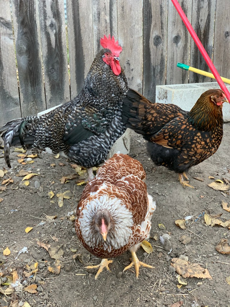 Backtracking just a bit, this summer we also adopted a flock of chickens. There has been such a learning curve in becoming Chicken Parents, but I think we’re getting the hang of it. We have a rooster (Kyle, named after the famous YouTube rooster of the same name), Camilla, Dolores, Gertrude, Sofia, Blanche, and Dorothy. Gertie hatched some chicks, but they don’t have names yet. One I like to call “Penguin” because that’s what it looks like, but we’re waiting for the gender reveal to really give them names.