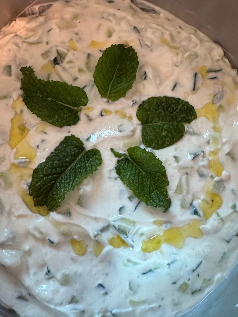 Mix all the ingredients until thoroughly combined. Keep tasting until you get the flavors right where you want them. If you want the dip to be more of a pourable sauce you can add a bit of water to the mixture. To get extra cucumber flavoring, press the juice from the seeds into the dip using a mesh strainer.