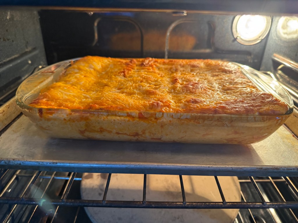 Like I’ve mentioned… there was a lot of filling. Like a lot, I still have some in a bowl in my fridge a lot. I filled in all the gaps with more dip, sprinkled a bunch of shredded cheese on top, and cooked in the oven at 375 for over an hour. I think if you didn’t go completely overboard and only made it as one layer it would have cooked up in much less time. We are looking for an internal temp of about 165 degrees F.