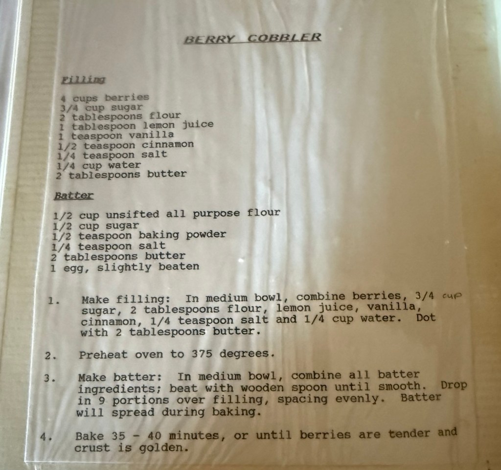 I was looking for my mom’s cobbler recipe that I had posted here years ago, and while scanning it over, I discovered not only was it incomplete, it made absolutely no sense. I apologize for anyone who tried to make it before, there was no way it would have worked. Here is the real-tried and true recipe.